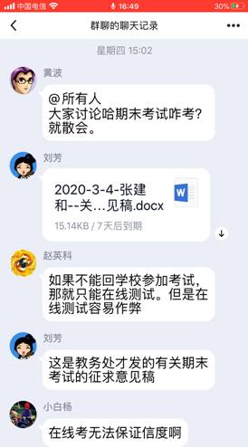 (通讯员:刘雪莲 刘芳)尽管疫情形势依然严峻,大学英语的老师们积极响应学校“停课不停教,停课不停学”的号召,于2月10日克服重重困难积极投身在线教学。尝试三周以后,大英一教研室30位老师于2020年3月5日下午2点通过QQ群交流的方式,参加了本学期教研室组织的第一次在线会议。主任黄波老师主持会议,主要内容是分享在线教学的经验和方法,讨论形成性评估和终结性评估的内容和方式。