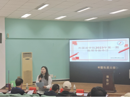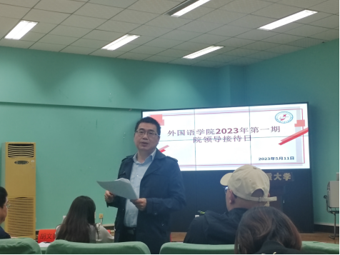 在北一楼报告厅举办2023年第一期院领导接待日,活动主题是外语学子国内外深造论坛。学院党委副书记胡文勤、副院长杨红燕、教育部出国留学培训与研究中心副主任赵英科、英语系党支部书记张地珂和本科各年级学生代表参加了本次活动。