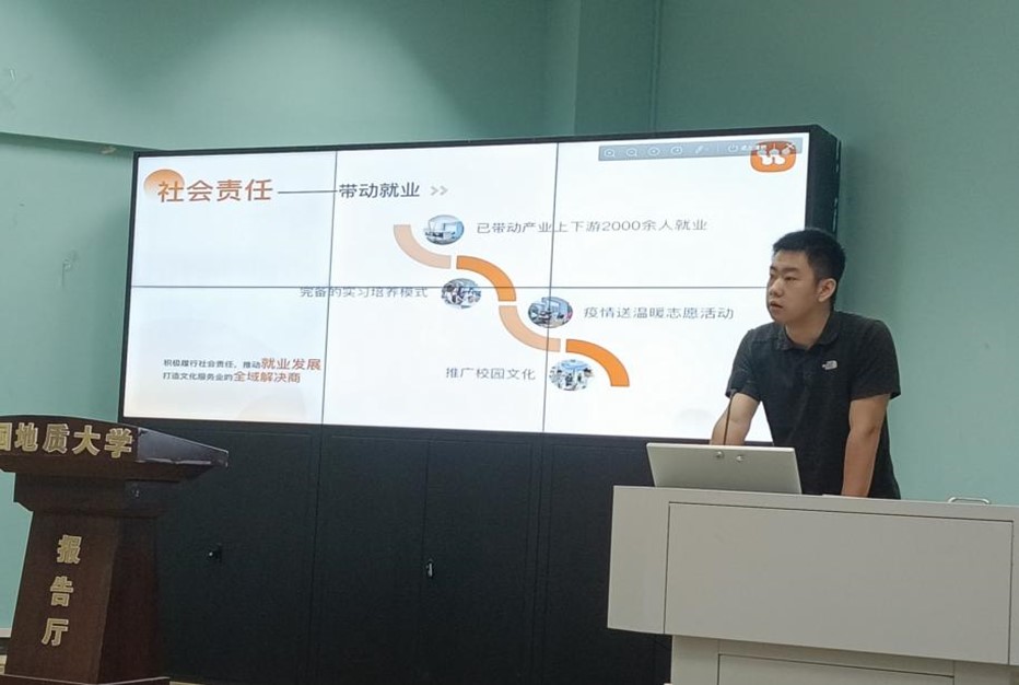 然后,我校艺术与传媒学院大四学生李乐介绍了他创办的武汉松木文化科技有限责任公司的基本情况,包括公司结构、主营业务和社会责任等,并具体说明了该公司如何在文创链方面进行创新,如何在地大校园打造“地心引力”这一高校文创品牌更好地服务广大师生及校友,如何依托公司实际运营业绩积极备战“互联网+”、“三创赛”,这些都引发了同学们的积极思考。