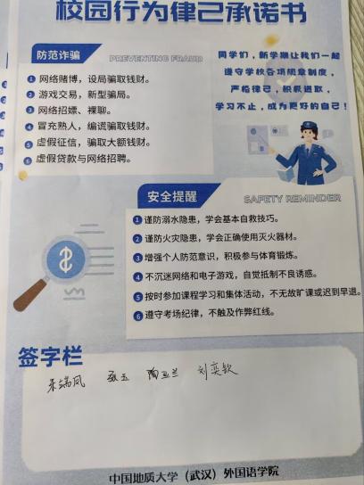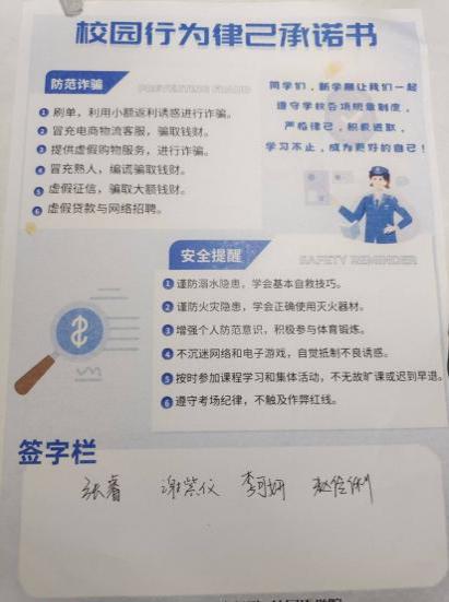 精心策划并开展以“寓教于寝,反诈同行”为主题的校园律己行为承诺书发放活动。