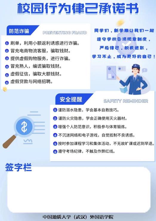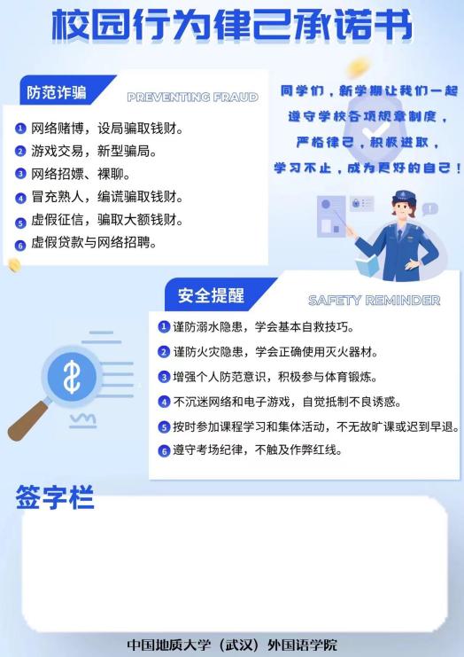 本次活动全面覆盖了外院学子所在的每一个寝室,以校园行为律己承诺书为载体,传达了学员对外国鱼们的关心和爱护。学院首先提醒同学们预防溺水事故,谨防火灾隐患等,增强学生安全意识和自我保护意识,鼓励学生积极参与体育锻炼,全面发展。除此之外,本次活动强调了遵守学校规章制度,有意识规范自身行为,自觉抵制不良诱惑的重要性。