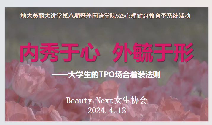 主办、Beauty Next女生协会承办的美丽大讲堂第八期“内秀于心 外毓于形”于4月12日下午15:00,在北一楼报告厅正式开讲。本次活动特邀资深专家——美丽大讲堂第八期特邀嘉宾王萍老师讲授大学生TPO场合着装法则,Beauty Next女生协会及麻豆传媒