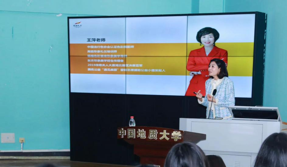 首先,王萍老师从自己的亲身经历开始,讲述了她对于美学的追求历程,然后从我们的日常护肤、面部色彩、化妆品的选择等方面详细展开,带我们更深入地了解了服装搭配的规则,得到了同学们的积极响应和热烈欢呼。