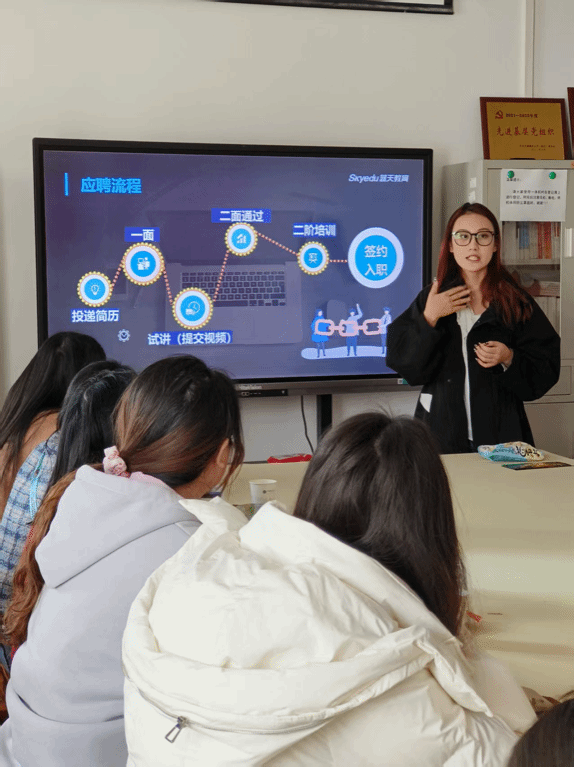 宣讲会上,两位HR首先分享了毕业后加入深圳蓝天教育的职业发展历程。她们以职场新人的视角切入,讲述了自身如何通过充分规划和持续学习逐步成长为优秀英语教师的发展经历。随后,她们详细介绍了此次深圳蓝天教育的招聘信息、麻豆传媒、培训体系以及职业发展路径,让与会同学们加深了对蓝天教育集团的了解和期待。