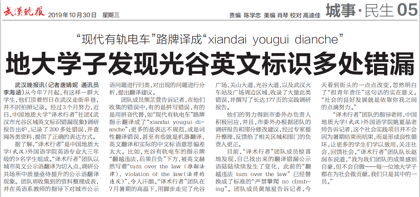 暑期社会实践学生团队“译术行者”的调研活动与调研成果,对该团队对武汉城市形象建设作出的贡献给予了积极评价,同时对外语学子的责任担当意识给予高度肯定。