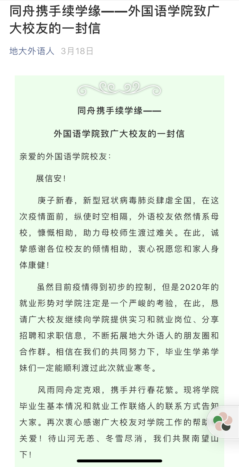促进2020届毕业生充分就业工作方案 致校友的一封信
