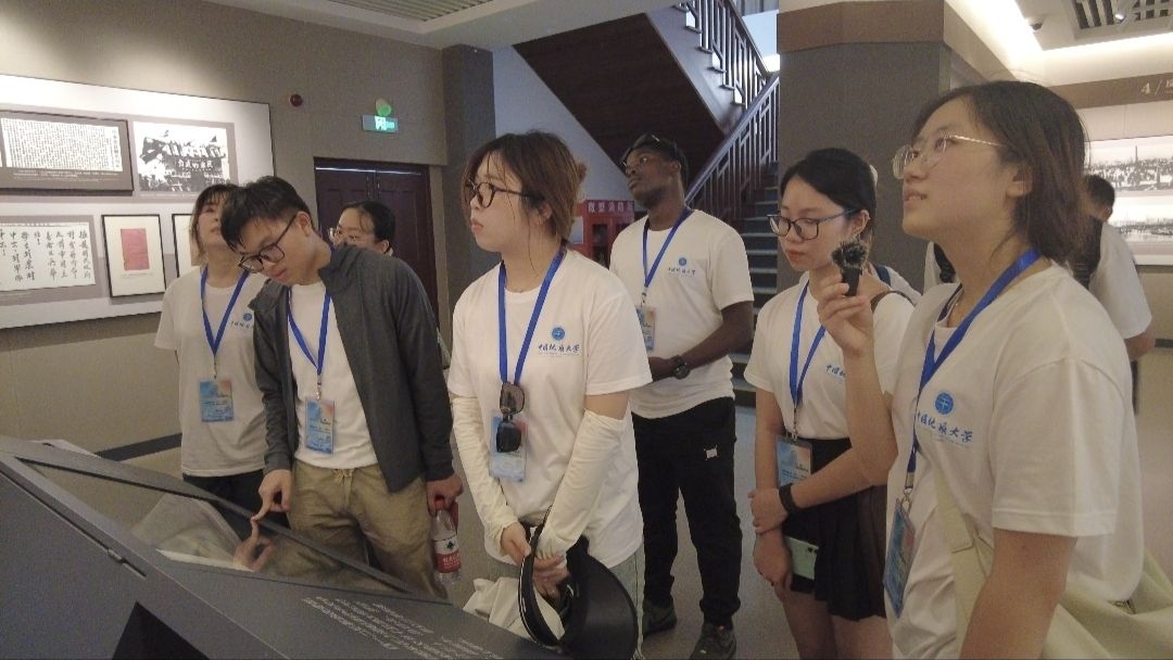 实践团国际学生成员正在参观馆内历史资料