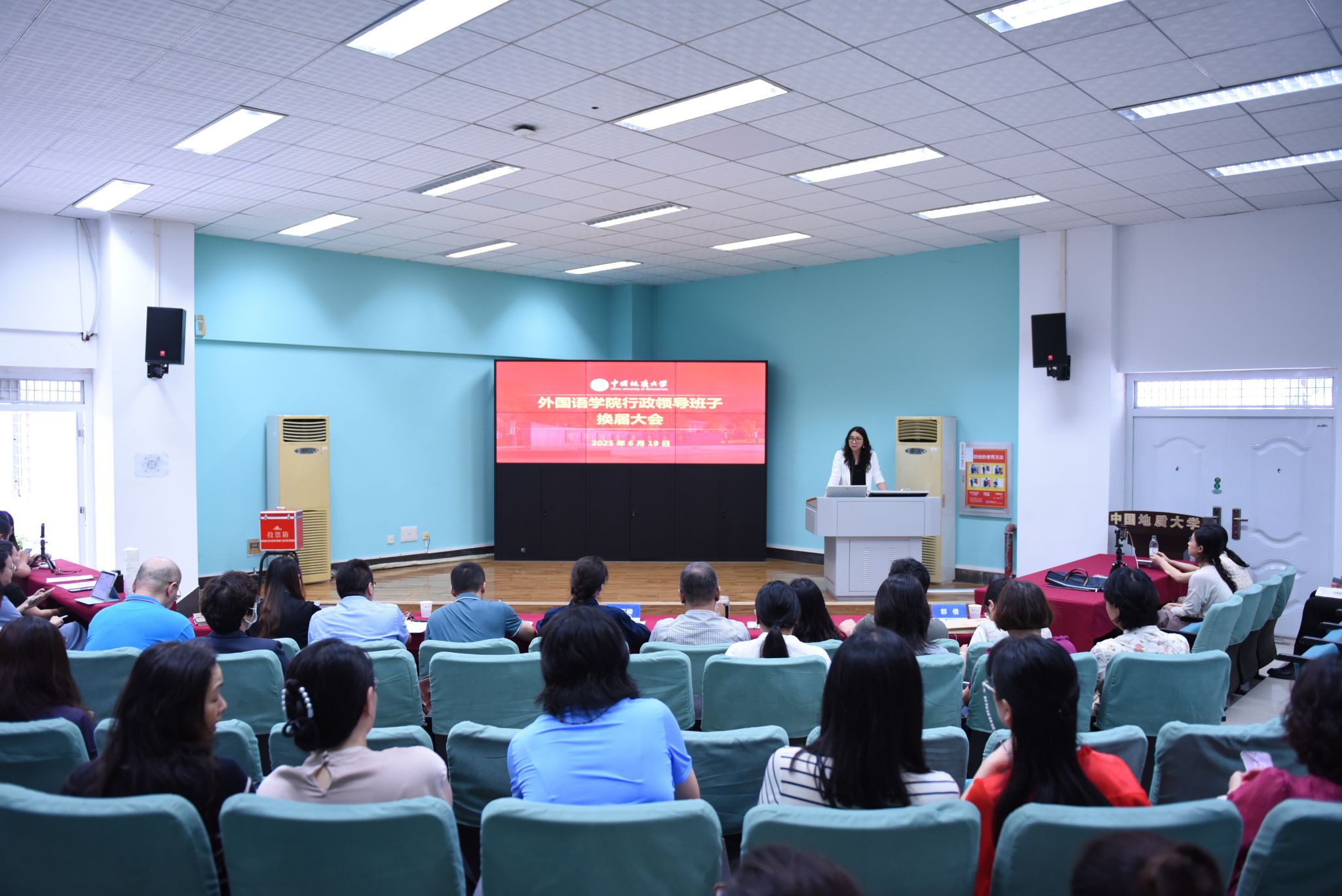 院长张峻峰、副院长杨红燕、张伶俐、周宏图和教育部出国留学培训与研究中心副主任赵英科分别就各自分管工作进行述职,内容涵盖学院工作、科研和学科建设、专业教育教学、大学英语教学和实验室建设、国际交流与社会合作服务等。