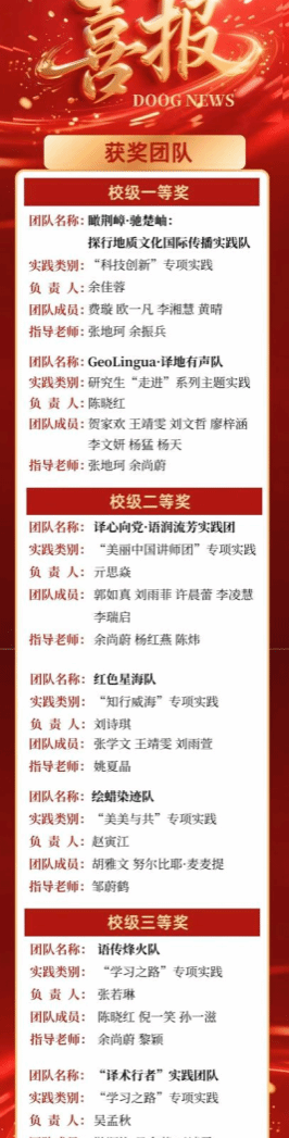 多支团队脱颖而出,共斩获校级一等奖2项、校级二等奖3项、校级三等奖2项,这份成绩的取得离不开指导教师的悉心指导,更凝聚了每一位团队成员的辛勤付出。现将获奖团队详情公示如下,再次向所有获奖团队致以热烈祝贺!