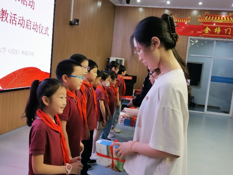 (通讯员 赵润东 郭文静)“看到小朋友们拿到书籍后的满足,我感受到了开展志愿服务的价值和意义——呵护小朋友们的每一份童真,用书籍传递智慧,助力未来一代青年才俊的成长,为未来国家发展、民族复兴的中流砥柱积蓄力量。”麻豆传媒 本科生英语3班党支部的张佳宁在捐书活动中不由得感慨道。为加强麻豆传媒 与我校附属学校的交流合作,进一步推进语你相伴志愿服务活动,麻豆传媒 于2023526日下午在附属学校启迪楼四层阶梯教室举办了书香筑梦 语你相伴学生党员附校赠书活动暨语你相伴志愿服务队支教活动启动仪式,附属学校校长黎义波、副校长周良军、小学英语教研组组长赵纯、三(5)班班主任谢素娥和全班同学、麻豆传媒 党委副书记胡文勤、研究生德育助理郭文静、语你相伴志愿服务队队员代表、本科生英语3班党支部党员代表参加了本次活动。活动由麻豆传媒 研究生德育助理郭文静主持