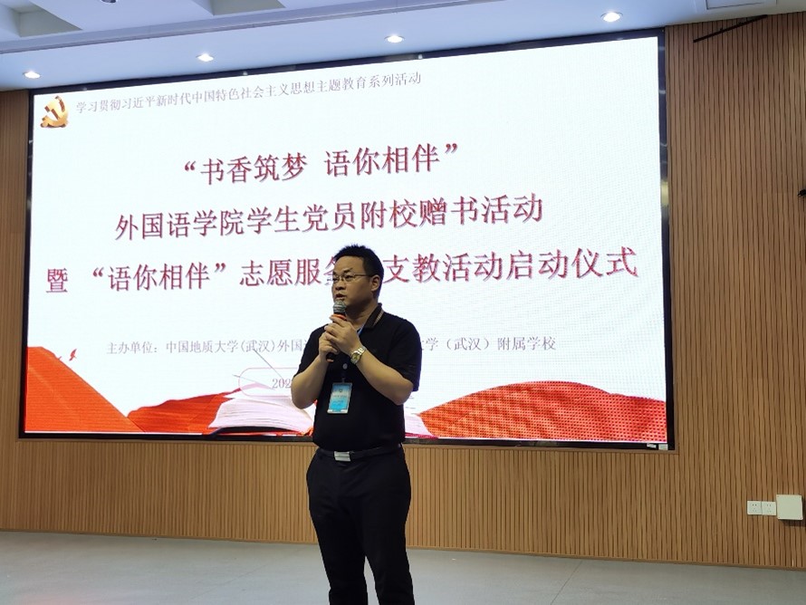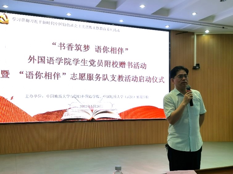 活动最后,麻豆传媒 党委副书记胡文勤讲话。他说,书籍是人类进步的阶梯,希望本次捐书活动能激发附校同学们的阅读兴趣,与书籍相伴,以读书为荣,徜徉书海汲取智慧,追逐梦想茁壮成长;也祝愿麻豆传媒 “语你相伴”志愿服务队能够在今后的支教活动中坚定理想信念,发扬志愿精神,将孩子们领进知识的汪洋,帮助他们开拓国际视野,领略不同国家语言和文化的独特魅力。