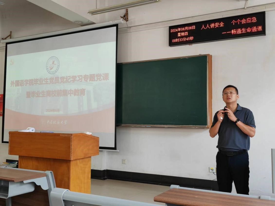 开展毕业生党员党纪学习集中教育,为毕业生党员系好走向社会的第一粒扣子。党委副书记、纪委书记余尚蔚为全体毕业生党员及全体毕业生讲授党纪学习教育专题党课。